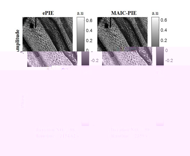 為進一步提高收斂速度,研究團隊将分光棱鏡放置在物體和CCD之間用于軸向分離與物體作用後的衍射光束,在分離的軸向光束中分别放置相同型号的CCD,且每個CCD到分光棱鏡的軸向距離不同。多個CCD同時工作可獲得軸向多個平面處的光強圖像,将采集到的多個軸向光強圖像用于校正CCD平面處的光場。為防止疊代收斂于局部最優解,在校正CCD平面處光場時,引入松弛因子α(0<α<1),使本次校正的光場與原光場按1-α: α的比例混合後形成新的光場,并将新的光場代入後續處理過程。軸向多平面光強限制方法在CCD平面處進行多次光場校正,可在最初幾次疊代建立合理的照明光場和物函數,并将其代入後續疊代,即可得到精确的照明光場和物函數,進而提高收斂速度。