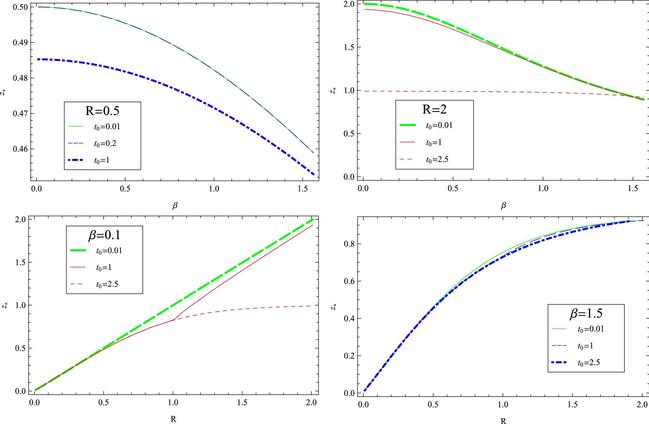 圖1:(上)相同圓半徑(R=0.5,2)下超曲面頂點z*和耦合常數在不同時間點的關系。(下)相同耦合常數下圓半徑和超曲面頂點在不同時間點的關系。其中紅色實線彎折點代表了球殼所在位置。