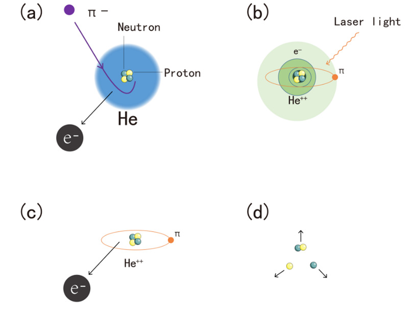 在鮑威爾發現宇宙射線中π介子的同年,“原子能之父”著名物理學家費米等人預言π-介子取代正常原子中的電子後可以形成各種奇異原子。這些奇異原子像“容器”一樣将π-介子存儲在分立原子軌道上,使我們可以利用激光技術加以研究。PSI 擁有領先世界的高亮度 1.3 MW 質子環形回旋加速器,這使得 PiHe 合作組能夠獲得高通量的π-介子束流。如圖所示,π-介子束流轟擊氦靶,會将氦原子的一個基态電子敲掉并占據該電子的空間位置,并被較為穩定的亞穩态軌道“囚禁”起來。這些獨特的亞穩态軌道與原子核距離較遠,因此可以保護π-介子在幾十納秒之内不被原子核俘獲,這使得激光光譜探測成為可能。随後,剩餘的一個電子也被發射出去,π-介子落入低軌道并被原子核吸收,核裂變反應産生質子、中子和氘核。
