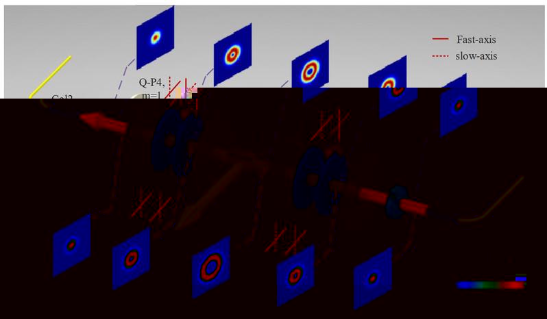 針對腔内直接産生高階龐加萊光束的靈活性不高,該論文提出了一種可調階高階龐加萊光束調Q光纖激光器,在環形腔内插入兩組渦旋半波片組實現腔内模式轉換及自再現,渦旋波片組中包括兩片不同階的渦旋波片(階數為1和3)和兩片四分之一波片。其中,兩片四分之一波片被用于實現兩片渦旋波片階數的加減(實現階數2和4的高階龐加萊光束的輸出)。在兩組渦旋波片中其模式轉換過程如圖1所示,通過光纖偏振控制器控制腔内偏振态,實現光束在兩個不同階的高階龐加萊球的偏振演化,并利用偏振無關分束立方實現輸出耦合,在光纖激光器腔内直接産生了穩定的及可調階的高階龐加萊光束的輸出。