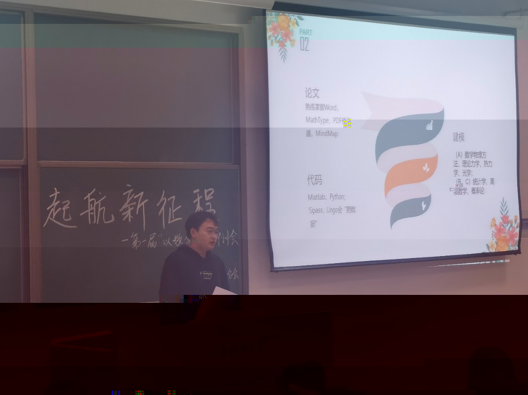 首先,20級應用物理專業的王佳強同學介紹了建模隊伍中常見的問題、出現意外的解決辦法并展示了一些建模經典例題。學長講到:“團隊中的三個人要相互磨合,相互協作,不是隻顧自己所負責的内容,而是通過不斷交流研讨,最終完成一篇凝聚團隊中每個人心血的論文。”