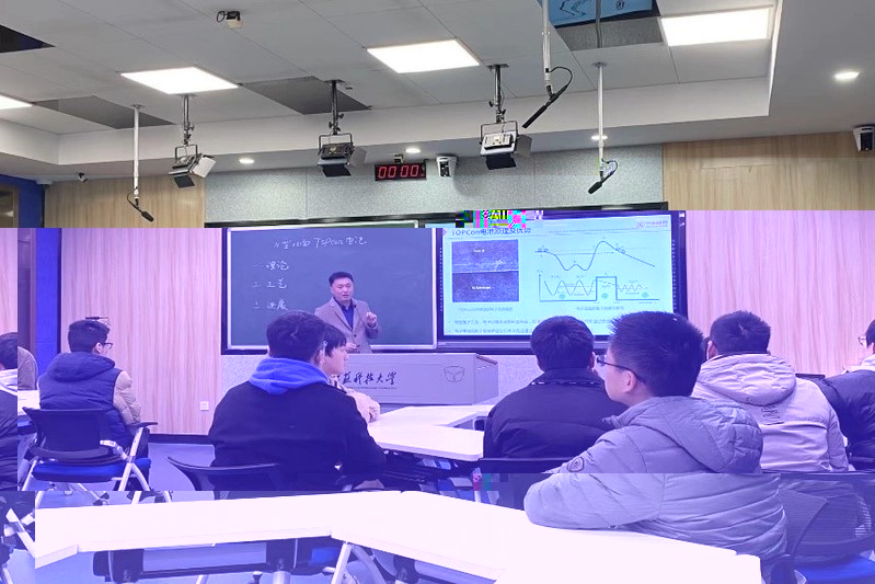 在報告中,杜博士結合他十餘年來在新加坡國立大學本科及博士階段課題研究經曆、國際國内知名光伏企業的技術研發經驗,用幽默生動的語言向我們講述了TOPCon電池的理論、工藝、進展、發展趨勢,讓學生了解到TOPCon電池廣闊的應用前景及太陽能電池光伏産業的飛速發展。同時,學生們在台下認真聽講,記錄筆記。在講座結束前,同學們都踴躍提問,積極發言,有學術方面的問題,也有即将畢業的學生對就業方面的疑問,而杜博士也針對大家在光伏器件溫度系數、激光加工、國内光伏産業布局方面的問題做出詳細的解答,同學們受益良多。