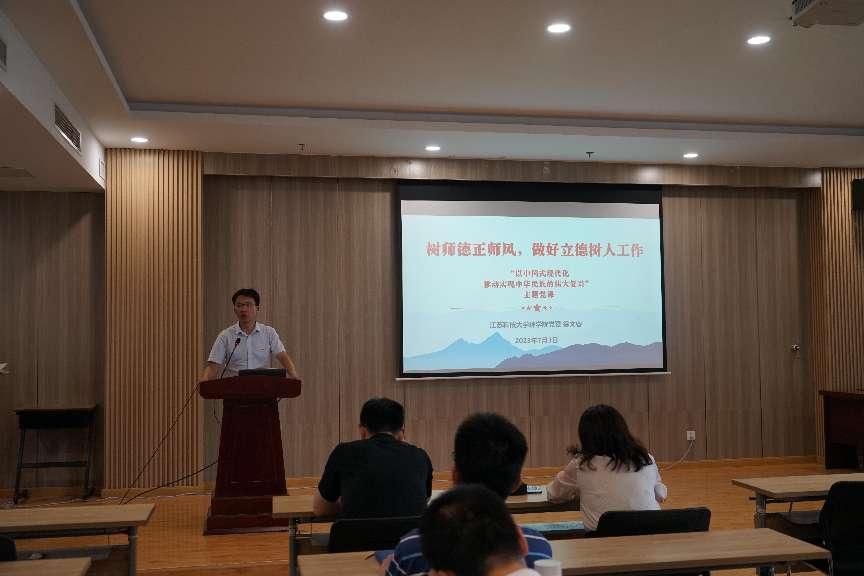 7月3日下午,伟德国际1946官方网黨委開展“樹師德正師風,做好立德樹人工作”教育活動,伟德国际1946官方网黨委書記徐文睿以“以中國式現代化全面推進中華民族偉大複興”為題,為學院全體教工黨員、研究生黨員代表作主題黨課。