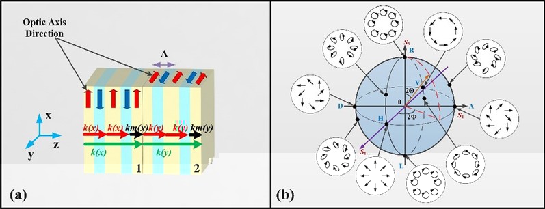圖1. (a)兩個正交放置的5%MgO:PPLN晶體的“三明治”結構(b)HOPS及其表面偏振态。