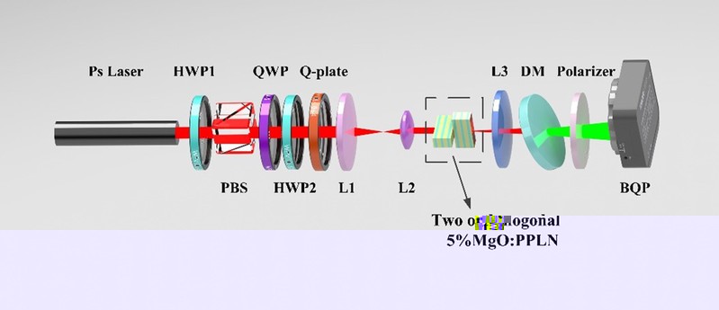 該論文采用兩個正交的5%MgO:PPLN晶體進行了HOPS的SH演示。基于準相位匹配(QPM)技術,推導了矢量耦合波方程,以模拟HOPS光束通過兩種晶體的SH,包括圓柱形矢量光束(CVBs)、EPCVBs和圓偏振渦旋光束。然後,建立了實驗裝置,揭示了CVBs和EPCVBs的SH呈現四葉形結構,并且表現出矢量特征。而圓偏振渦旋光束變為拓撲荷數為兩倍的135°線偏振渦旋光束,并證實了OAM守恒。此外,CVB、EPCVBs和圓偏振渦旋光束的最大SH轉換效率分别可達25.3%、23.4%和29.4%,這可能對高效促進矢量渦旋光束的SH生成具有指導意義。