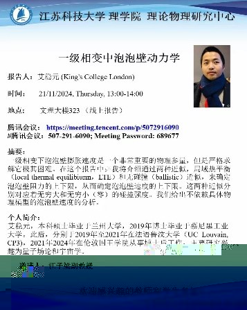 2024年11月21日下午,倫敦國王學院的艾穩元博士應邀在我院理論物理研究中心做線上學術報告,題為“一級相變中泡泡壁動力學”,本次報告由伟德国际1946官方网汪子梁副教授主持。