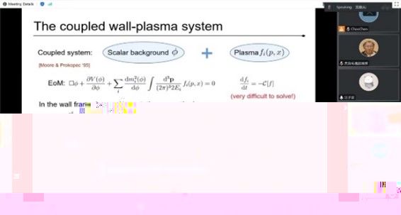 報告中,艾穩元博士首先對一級相變下泡泡壁動力學的一般方法進行了深入淺出的介紹,為在場聽衆搭建了理解後續内容的理論框架。随後,他基于局域熱平衡和無碰撞近似理論,給出了泡泡壁速度的深入分析,強調了其在宇宙學觀測上的重要性。