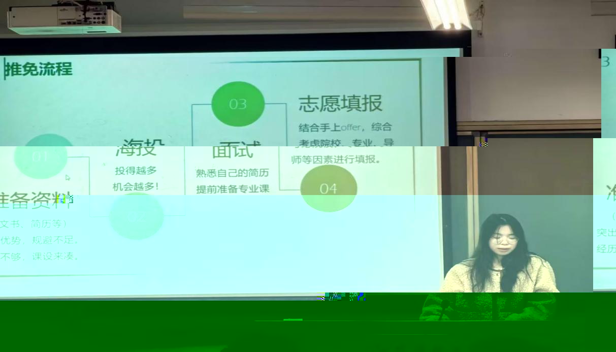 應用物理學專業推免至中國科學院大學上海光學精密機械研究所的唐曉剛同學和臧子涵同學向大家分享了保研步驟。首先熟知學校保研政策,關注心儀院校保研接收政策,加強與高年級學生之間的交流溝通,減少信息差,同時保持理性平和的心态。其次努力提高必修課成績以及績點排名,争取高分通過英語四六級。最後積極參與專業相關的高水平學科競賽和實習實踐,以項目為依托完成調研報告、科研論文。