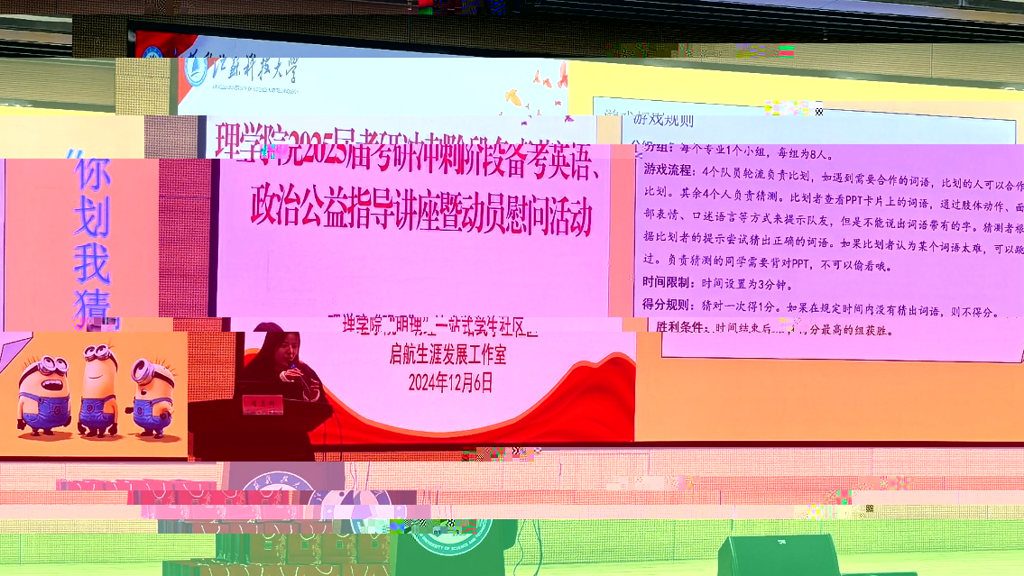 活動第二階段,學院為考研學子們精心準備了精彩的考前心理調适及減壓互動遊戲。“你劃我猜”小遊戲不僅考驗了同學們的想象力和表現力,還增進了同學之間的互動與合作。通過這種輕松愉快的方式,同學們在緊張的備考之餘得到了有效的放松,也在歡聲笑語中感受到了學院的關懷與支持。