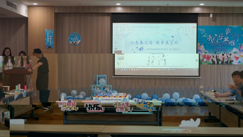 班會伊始,一部精心制作的暖場視頻點亮全場。從青澀懵懂的入學瞬間到實驗室裡的專注身影,從運動場的拼搏汗水到梧桐樹下的并肩漫步,300秒的光影濃縮了畢業生們四年的成長軌迹。當熟悉的場景躍然屏上,會場響起陣陣感慨的掌聲與會心歡笑,青春的畫卷在每個人心中徐徐鋪展。