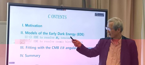 6月10日,Lee教授繼續帶來題為《Early Dark Energy Models and Cosmological Tensions》的第二場報告。在首日報告基礎上,他将視角拓展至當前宇宙學研究的前沿問題——哈勃常數危機與宇宙雙折射現象。他指出這兩大觀測難題對宇宙學标準模型構成嚴峻挑戰,并提出其早期暗能量模型可作為可能的解決方案,更展示了基于10維參數空間的數據拟合結果,闡述該模型在緩解哈勃常數危機與宇宙雙折射問題方面具有“一箭雙雕”的潛力。他進一步系統分析各參數在模型中的敏感度和作用強度,打破了“早期暗能量無法解釋宇宙雙折射”的傳統觀點,強調了參數優化在宇宙學理論發展中的關鍵作用。